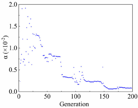where is the kth dimension objective of the ith individual along the Pareto front in the tth generation population. The convergence factor α represents the average Euclidean distance between the leading-edge individual and the previous generation. Figure 11 shows the change in α with the evolution generation. As illustrated, α decreases rapidly in the first 100 generations, indicating that the objectives gradually converge in the process of crossover, mutation, and migration. After generation 130, the evolution slows down, and the α is reduced to 0.001.