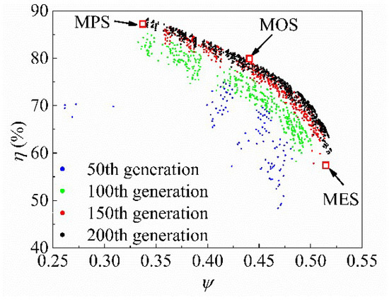 Figure 12 shows the Pareto front shape of the 50th, 100th, 150th, and 200th generations after transformation. As the initial population is randomly generated, the distribution position of the population at the 50th generation is relatively disorderly and scattered. When the evolution generation reaches 100, the Pareto front shape initially becomes an approximate arc. Then, the population distribution of the 150th generation moves to the upper right, and the spacing between individuals decreases. Finally, the distance between individuals further reduces in the 200th generation. As the Pareto front shape barely changes compared with the 150th generation, it can be assumed that the optimization process has converged.