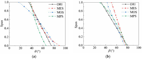 The distribution curves of θ and β along the spanwise direction: (a) the radial distribution of θ; (b) the radial distribution of β.