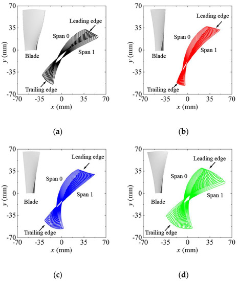 Figure 14 shows the blade profiles of different schemes. The blade bending angle (θ) of the MES and MPS changes little along the spanwise direction under the three optimization schemes. Using the MOS, the blade bending angle decreases rapidly, making the arc at the top of the blade approximate a straight line. In addition, the maximum radial twist of blades exists in the MPS. Due to the rapid change in β at the blade tip, the blade twists most severely near the blade tip section (span 1). For MES and MOS, the change in β angle is approximately linear, and MES provides the minimum radial twist of blades.
