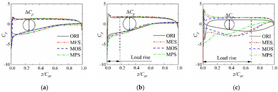 Figure 15 shows the distribution in three spanwise sections. The static pressure loss coefficient difference between the suction and pressure surface (ΔCp) represents the blade load in a specific relative chord position. At the blade root section (10% span), the distribution of different schemes shows a high coincidence. At the blade middle section (50% span), the ΔCp of the three optimal schemes slightly increases in the blade leading edge compared to the ORI, demonstrating that the blade load in this area is improved. At the blade middle section (90% span), the loading increase area extends to the middle of the blade, and the increase in blade load is enhanced.
