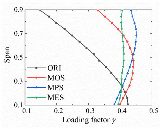 where is the static pressure difference between the suction and pressure surface, and is the average axial velocity at the fan inlet. Figure 16 shows the blade load factor distribution along the spanwise direction. Among the four schemes, only the MES has a nearly linear distribution of the load factor. The load factor curves of ORI, MOS, and MPS show nonlinear shapes with different curvatures. The blade load decreases gradually along the spanwise direction for the ORI scheme, which indicates that the blade load concentrates on the blade area near the endwall. The blade load of the MES increases first and then decreases along the spanwise direction, and the maximum load point (MLP) is located at 45% of the span. For the MOS, the blade load factor distribution along the span is almost constant. The blade load of the MPS exhibits the same form as the MES, though the MLP moves to 65% of the span. It is noteworthy that the load distribution of all three optimized models is more uniform along the spanwise direction relative to the original scheme, and the MLP moves toward the middle of the blade.