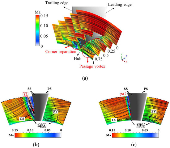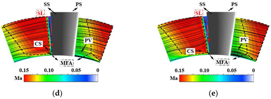 Comparison of streamline distribution and Mach contour near the endwall: (a) flow characteristic near the endwall; (b) ORI; (c) MES; (d) MOS; (e) MPS.