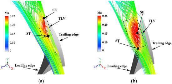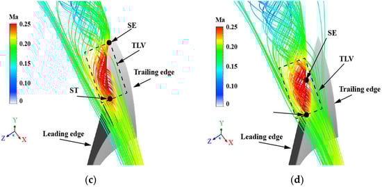 The new blade bending and twisting law imparts a smooth blade load distribution near the endwall. However, the blade tip load increases simultaneously. Figure 18 shows a comparison of the streamline at the tip clearance region. For the ORI impeller, a pressure difference between the suction and pressure side exists in the blade tip. The tip leakage vortex (TLV) is generated at the middle position of the blade and detaches at the trailing edge. After optimization, the pressure difference increases, indicating that the tip leakage vortex’s starting position (ST) and separation position (SE) have changed accordingly. The tip leakage vortex of the MES scheme starts from the middle of the blade. It develops along the blade suction surface and separates at the blade’s trailing edge. Tip leakage vortices in the MPS and MOS schemes are formed at the blade’s leading edge, separate from the blade surface near the middle of the blade suction surface.
