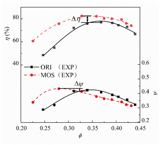 The mean optimal scheme (MOS) model is selected as the final scheme, and a pneumatic performance test is carried out. Compared to the prototype fan, the maximum efficiency increased by 5.44%, and the maximum total pressure coefficient increased by 2.47%. Thus, the optimum working condition of the MOS fan moved to a low-flow-rate zone.