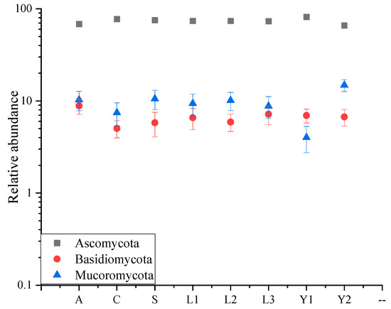 Relative abundance of fungi on rice grain. The relative abundance of Eumycota level, containing Ascomycota, Basidiomycota and Mucoromycota are represented by a square, circle and triangle, respectively.