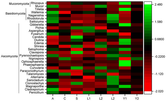 Heat map of the fungal community variation on rice grain. The highest relative abundance of 30 fungal genera were selected to generate the heat map. The color-coding was based on the average relative abundance at the genus level of each sample.