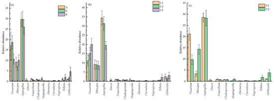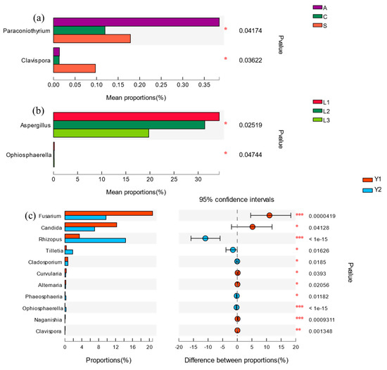 Among the 30 genera with high relative abundance, the harmful genera for rice storage included Fusarium sp., Rhizopus sp., Aspergillus sp., Mucor sp., Penicillium sp., Cladosporium sp., Magnaporthe sp., Alternaria sp., Curvularia sp., Nigrospora sp., Tilletia sp. and Gibberella sp. (Figure 5 and Table S4). The relative abundance with significant differences was found for Penicillium sp. (1.22 ± 0.25%) at sampling point A, point C (0.77 ± 0.20%) and point S (0.48 ± 0.06%). The relative abundance of Nigrospora sp. was also disparate at different orientations. The highest one was at sampling point C (0.31 ± 0.09%), the next highest one was at point S (0.14 ± 0.05%) and the lowest was at sampling point A (0.10 ± 0.02%). Another relative abundance of Aspergillus sp. showed variation in the vertical positions. L1 (34.41 ± 3.84%) was the highest, followed by L2 (31.41 ± 3.78%) and L3 (19.50 ± 2.16%). Meanwhile, there was a significant increase in the relative abundance of Rhizopus sp. with the storage time extended, which increased by 10.97% in the second year. In contrast, the relative abundance of Fusarium sp. decreased eventually with increased storage time, decreasing by 11.41% compared with the first year (Table S3).