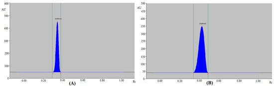 For the GFT estimation by the routine HPTLC assay, various Ch/MOH concentrations within the 45–90% Ch range were investigated as the routine mobile phases. The mobile phase compositions and various chromatographic parameters are summarized in Table 1. The results obtained showed that the routine mobile phase Ch/MOH (85:15, v/v) offered a well-resolved and intact chromatographic peak for GFT at Rf = 0.3600 ± 0.0100 (Figure 1A). GFT was also predicted to have As values of 1.040 ± 0.0200, which are suitable for GFT analysis. As a result, the Ch/MOH (85:15, v/v) was chosen as the final mobile phase for GFT estimation using the routine HPTLC assay.