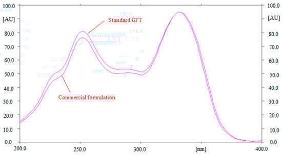Ultra-violet (UV) absorption spectra of standard GFT and commercial formulation, superimposed.