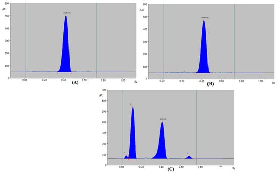 HPTLC densitograms of GFT obtained under (A) acid degradation, (B) base degradation, and (C) oxidative degradation of GFT using the greener HPTLC method.