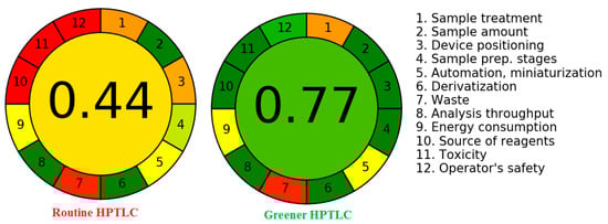 Various methodologies are used for the greenness evaluation of pharmaceutical analytical methods [,,,,], while AGREE exclusively utilizes all 12 GAC components for greenness assessment []. Accordingly, the greenness index of both assays was assessed using “AGREE: The Analytical GREENness Calculator (version 0.5, Gdansk University of Technology, Gdansk, Poland, 2020)”. Figure 5 depicts a representative diagram for the AGREE index of routine and greener HPTLC assays. For routine and greener HPTLC assays, the AGREE index was found to be 0.44 and 0.77, respectively. These results demonstrated the excellent greenness index of the greener HPTLC assay compared to the routine HPTLC assay for GFT estimation.