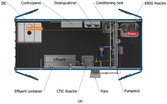 Drawings of the pilot units (a) Pilot units contents with wastewater and biogas flow direction marked; (b) overview of the 3D drawing. (c) EGSB unit layout. (d) CFIC reactor layout.