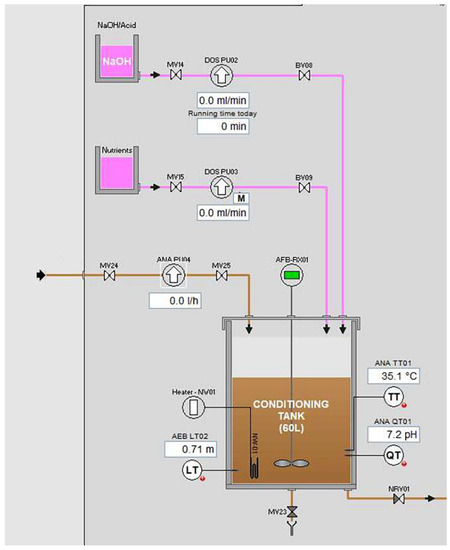 Wastewater was automatically pumped from the 1 m3 IBC storage tank to the conditioning tank by pump 1 to reach a setpoint (Figure 2). Different height setpoints were given during the pilot study, which induce different hydraulic retention times in the conditioning tank. The wastewater in the conditioning tank was well mixed by an overhead mixer and its pH, nutrient content, and temperature were adjusted by proportional integral derivative (PID) control of the chemical dosing pumps 1 and 2 (Figure 2) and the heater, respectively. The feed pump 1 was regulated by the water level (level transmitter) in the conditioning tank. Wastewater in the conditioning tank after adjustment was further pumped to the EGSB by pump 2 (Figure 2).