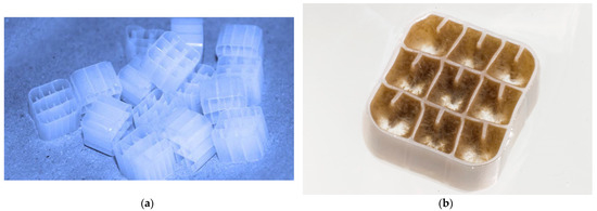 BWTX® carrier without biofilm growth (a) and with matured biofilm growth (b).