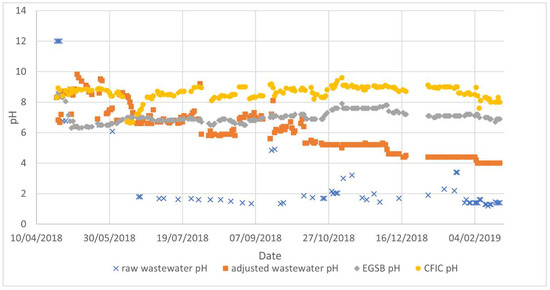The feed wastewater conditions, such as temperature and pH, were adjusted in the conditioning tank automatically by turning on/off the heater and dosing buffer solution. It can be observed that during the adaptive phase, the raw wastewater pH fluctuated in a wide range from 12 to 1.4. Acid and NaOH solutions were used to adjust the pH in the conditioning tank. The EGSB pH was relatively constant at 7, while the effluent from CFIC was approximately around 8.7 (Figure 6). In the testing phase with the conditioning tank, wastewater pH was adjusted to 6.4 and gradually decreased to 4 from the low initial raw wastewater pH at 2. Without bringing pH higher before feeding to the EGSB, due to high VFA content and salinity, the EGSB pH was able to sustain at pH 7–7.6 without adding external buffer solution. The average alkalinity was 100 meq/L. The CFIC effluent pH can reach up to 8.6, attributed to both acid consumption and air striping effects.