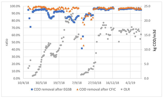 The COD removal efficiency from the complete system, i.e., after the CFIC, was stable at an average of 98% during the whole study, which is generally independent of the tested loading rates and wastewater composition variations (Figure 8). CFIC, as a polishing stage for EGSB, consumes the residual COD that is present in the EGSB effluent. Its COD removal efficiency during the adaptive phase was on average 7.6% of the COD removed by the complete anaerobic and aerobic system.