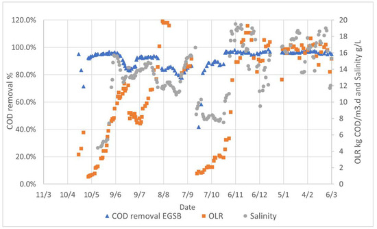The wastewater salinity in adaptive and testing phases ranged between 4.4 and 15.7 g/L and 7.5 and 19.5 g/L, respectively (Figure 9). Table 5 shows the comparison of EGSB performance at different OLR and salinity. The results show that, at salinity concentrations of about 13–17 g/L in wastewater, COD removal greater than 90% was achieved. This was contradictory to the study conducted by Sibel and Nusret 2016, where salinity over 10 g/L reduced the COD removal efficiency to 80%, while in the literature granules were not adapted to high salinity wastewater before. It is not obvious that salinity at our tested range had negative effects on the EGSB reactor. This observation is in agreement with the conclusion from [22] and could be due to gradual adaptation.