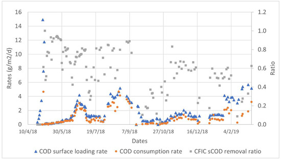 Figure 10 shows the COD loading and consumption in the CFIC reactor as a function of the protected surface area loading rate (SLR) of the biocarriers and the removal efficiency. The average COD removal efficiency in the CFIC section was around 80% during the adaptive period considering the very low COD concentrations after the EGSB treatment giving SLR at 0–2 g COD/m2·d. Due to the EGSB granular sludge limitation in June 2018 (Figure 10), the SLR increased to 6–11 g COD/m2·d, and the removal efficiency dropped in the beginning, although it recovered quickly to over 80% (Figure 10). The decrease could be due to part of the newly filled granular sludge having fluffy particles that were washed out and fed into the CFIC stage. The relatively low active aerobic biofilm on carriers and slow biofilm growth rate during the abrupt increase in the COD loading rate can also lead to reduced biofilm efficiency. In the testing phase in October, the wastewater contents present a major change (Table 1) with reduced acetic acid and organic iodine, as the sCOD removal efficiency was generally at 40%. With the increased acetic acid in wastewater after October, the sCOD consumption rate was about 60% (Figure 10). The SLR to CFIC was within 5 g/m2·d, which is about 5–10 times lower for the capacity of such a system. The relatively low removal rate was mostly attributed to the non-biodegradable residual in the wastewater such as organic iodine.