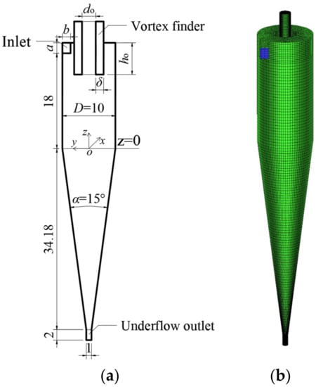 Geometrical parameters (a) and fluid domain mesh (grid number: 308,046) (b) of the hydrocyclone.