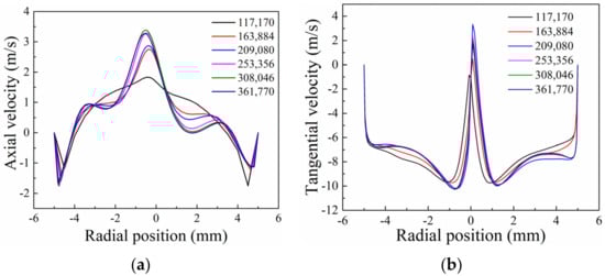 The axial velocity (a) and tangential velocity (b) under different grids number.