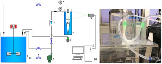 Scheme of experimental apparatus: 1-mixing tank; 2-valve; 3-pump; 4-rotor flow meter; 5-piezometer; 6-hydrocyclone; 7-plexiglass tank; 8-high-speed camera; 9-laser generator; 10-high-performance computer.