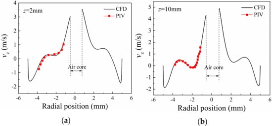The axial velocities at z = 2 mm and z = 10 mm extracted from measured and simulated results are shown in Figure 4. Due to the influence of the hydrocyclone structure and the air core, only half of the flow field can be measured precisely. It is obvious that the velocity distributions and trends obtained by experiment and simulation are in good agreement. The axial velocity shows that the fluid flows down at the wall and upward at the center. After uncertainty analysis, the maximum error of the numerical simulation on the calculation results of the flow field is 3.17%, which is acceptable.