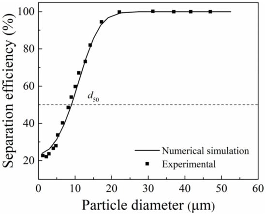 Quartz particles with a density of 2600 kg·m−3 and a feed solids concentration of 2% by volume are added into the storage tank and stirred evenly. The inlet velocity is controlled by a valve and adjusted to 12 m·s−1. Then, the suspensions were collected synchronously from the inlet and underflow when the flow field was stable. The samples are analyzed by Mastersizer 2000 laser particle characterization system, and then the particle size distribution is obtained. The separation efficiency of the measured and simulated methods is shown in Figure 5. On the whole, the separation efficiencies obtained by the two methods are in good agreement. The prediction accuracy of the relatively coarse particles is higher than that of fine particles. However, when the particle size exceeds 5 μm, the maximum error of the Mixture model on the separation efficiency is only 4.87%, which is acceptable. Therefore, the Mixture model could describe the separation performance of hydrocyclone accurately.