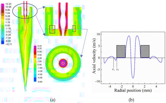 (a) Location and structural form of the short-circuit flow, (b) axial velocity distribution at z = 14 mm on the y = 0 mm section.