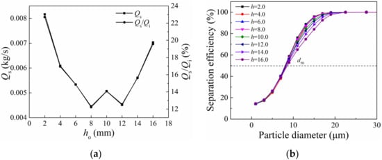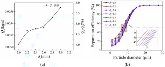 The vortex finder diameter is closely related to the shape of the air column and the overflow flow rate. The overlarge diameter would generate a large air core, which is larger than the underflow diameter, then the separation performance would deteriorate rapidly [,]. The effect of seven kinds of vortex finder diameters (2.0 mm, 2.2 mm, 2.4 mm, 2.6 mm, 2.8 mm, 3.0 mm) on the short-circuit flow and separation efficiency are shown in Figure 7. When the vortex finder diameter is 3.2 mm, the short-circuit flow interfering with the axial downward flow makes extracting the short-circuit flow rate difficult. Therefore, the value of the short-circuit flow when do = 3.2 mm is not shown in Figure 7a. The total inlet flow rate Qi at the inlet velocity of 12 m·s−1 is 3.594 × 10−2 kg·s−1. In Figure 7a, the mass flow rate of the short-circuit flow and its ratio increase with the vortex finder diameter increases. That is due to the increasing vortex finder diameter shortening the flow distance of short-circuit flow. Therefore, the larger vortex finder diameter increases the tendency of the feed into the overflow pipe. When 2.2 < do < 2.6, the increasing rate of the short-circuit flow is relatively slow. That might be that the separating space under this vortex finder diameter is suitable for generating the circulation flow. The circulation flow located at the cricoid region between the vortex finder’s outer wall and the cyclone’s inner wall facilitates the separation of the surrounding fluid. Furthermore, studies have found that the increased vortex finder diameter can increase the circulation flow rate to some extent []. In addition, the ratio of the short-circuit flow to the inlet flow has the same trend as that of the short-circuit mass flow rate because the total inlet flow rate is constant.