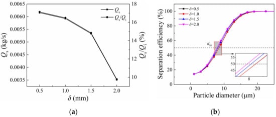 The vortex finder wall thickness affects the pre-separation space of the hydrocyclone. A thick-walled vortex finder would compress the separating region. The effect of four wall thicknesses on the short-circuit flow and separation efficiency was studied, as shown in Figure 8. The short-circuit flow rate and its ratio monotonically decrease with the increased wall thickness of the vortex finder, as shown in Figure 8a. Compared with the δ = 0.5 mm, the short-circuit flow rate has the smallest ratio of 9.78% at δ = 2.0 mm, and a reduction of 42.91%. The result that the thick-walled vortex finder can effectively inhibit the short-circuit flow is consistent with Xu [] and Zhao []. The thick-walled vortex finder increases the distance of inlet feed directly flows into the vortex finder. Therefore, part of the short-circuit flow could reenter the separation region under the influence of the flow field.