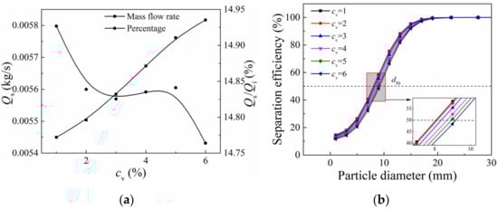 Feed concentration determines the particle number of the flow field in the hydrocyclone. The effect of the feed concentration on the short-circuit flow and separation efficiency is shown in Figure 11. Due to the increasing feed concentration, the fluid would entrain more particles into the vortex finder. So, the short-circuit flow rate increases with the feed concentration increases, as shown in Figure 11a. However, its ratio slightly decreases while the feed concentration increases, the maximum difference in the ratio is 0.17%. Therefore, the feed concentration could increase the short-circuit flow but slightly affect its ratio. In Figure 11b, the partition curves decrease as the feed concentration increases. The separation efficiency indicates that the recovery rate of both the fine particles and coarse particles to underflow is reduced. Meanwhile, the particle cut size (d50) increases as the feed concentration increases. This might be because the higher feed concentration increases particles’ collision, leading to the displacement of particles. Therefore, the lower the feed concentration is conducive to the classification of the fine particles.