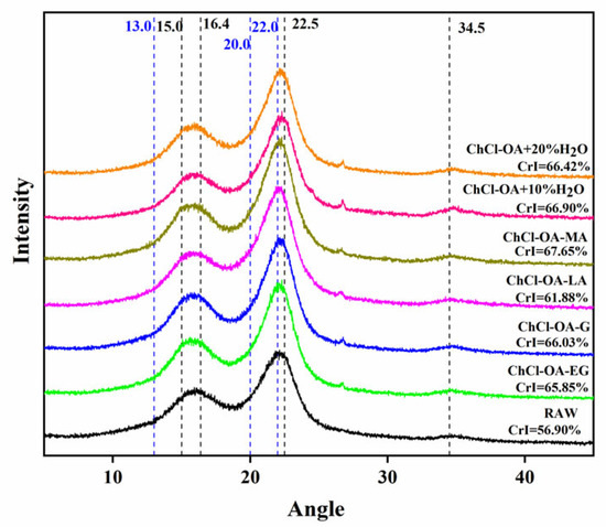 The X-ray diffraction (XRD) patterns of bagasse cellulose treated with different deep eutectic solvents (DESs).