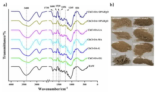 The Fourier Transform Infrared (FTIR) spectra (a) and images (b) of bagasse treated with different DESs.