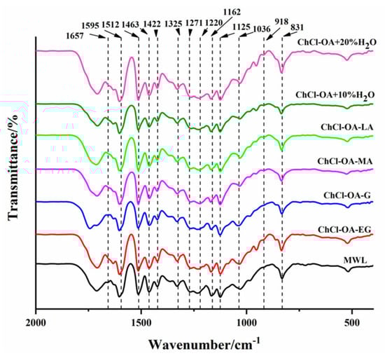Figure 4 shows the FTIR spectra of the DES-L and MWL. The results showed that different DES treatments had no significant effect on DES-L structure. The characteristic bands of lignin aromatic ring vibrations were observed at 1595, 1512, 1462, and 1423 cm−1. The absorption vibration of the clove nucleus, guaiacyl group, the C-C/C-O/C=O vibration of the guaiacyl group, and the C-H vibration are attributed to the peaks at 1271 cm−1, 1224 cm−1, 1125 cm−1, and 1036/831 cm−1 near 1325 and 1220 cm−1 [26]. MWL had a peak at 1657 cm−1, which was derived from non-conjugated carbonyl and ester groups and conjugated carbonyl vibrations, while DES-L had no peak there. This finding suggested that DES treatment may have disrupted the conjugated structure of lignin by breaking the double bond at the α-position of the lignin molecule. It is worth noting that the peak at 918 cm−1 indicated the presence of a small amount of cellulose and the six DES-Ls had a weak peak here.