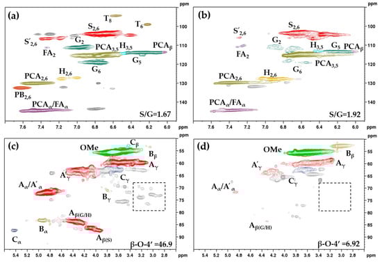 Two-dimensional HSQC analysis aimed to compare the structural changes in the MWL and DES-L. The side chain (δC/δH 50–90/2.5–6.0) and aromatic (δC/δH 90–150/5.0–8.0) regions of the 2D HSQC spectra of MWL and DES-L are shown in Figure 5. The main substructures observed in MWL and DES-L by 2D HSQC are shown in Figure 6. The 2D HSQC spectra of other DES-Ls are shown in Figure S2 and Table S4 shows the main cross-linking signal peak in lignin samples. The abundances of the principal lignin linkages and the S/G ratios were estimated based on the previous literature [27].