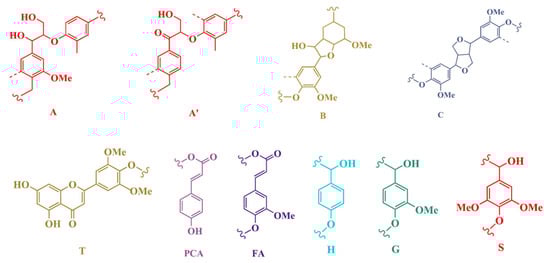 Main substructures observed in MWL and DES-Ls by 2D HSQC: (A) β-O-4′ ether linkages, (A’) β-O-4′ ether linkages with, acetylated at γ-carbon, (B) resinol, (C) phenyl-coumaran, (PCA) p-coumarate acid, (FA) ferulic acid, (T) flavone tricin, (H) p-hydroxyphenyl units, (G) guaiacyl units, (S) syringyl units.