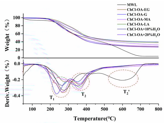 The pyrolysis stage of lignin has three segments. The first stage occurs at 80–160 °C, which is mainly ascribed to the dehydration and degradation of low-molecular weight lignin; the second stage is the pyrolysis of lignin phenylpropane polymer at 160–470 °C; the third stage is the lignin carbonization stage at 470–600 °C [31]. The TG analysis of different DES-Ls is shown in Table S6. Figure 8 shows the TG and DTG curves of different DES-Ls. As shown in Figure 8, the thermal degradation behaviors of the six DES-Ls are consistent. In addition, the thermal stability of MWL is superior to DES-Ls due to its undamaged structure. In the second stage, all the six DES-Ls have two inflection point temperatures (T1 and T2), while T2’ of MWL occurs in the third stage (470–600 °C) at higher temperature of lignin degradation. The T1 and T2 of DES-Ls correspond to a large number of cleavages of lignin side chains and depolymerization of phenylpropane units, respectively. The residue reacts into coke with the increase in temperature, and the mass of MWL and DES-L remain constant until 730 °C and 600 °C, respectively.