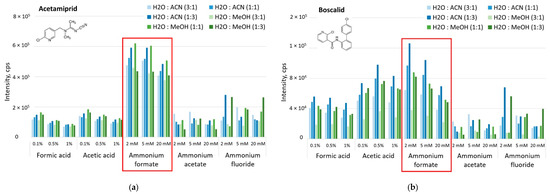 Because pesticide residues are trace contaminants of fruits, to obtain maximum signal intensity for the tested pesticides, the ionization efficiency of the tested compounds was increased by selecting the optimal composition of the sample solvent. The solvents were chosen to correspond to the eluents and their modifiers used in UHPLC-MS/MS (type and ratio of water-methanol, water-acetonitrile), additives modifying the mobile phase (formic acid, acetic acid, ammonium formate, ammonium acetate, ammonium fluoride), and the concentration of the mobile phase modifying the additive (0.1%, 0.5%, 1% for acids, 2 mM, 5 mM, 20 mM for salts). Such an experiment gave information on which solvent is the most proper for target analysis. For this purpose, the experiment in the flow injection analysis (FIA) mode by direct injection that bypassed the chromatography column at 100% elution with water for one pair of MRMs was run. The signal intensity for each pesticide along with each combination of considered parameters is presented in Figure 1.