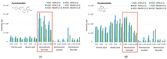 Intensity for: (a) acetamiprid, (b) boscalid, (c) pyraclostrobin, and (d) pendimethalin during ionization matrix experiment.