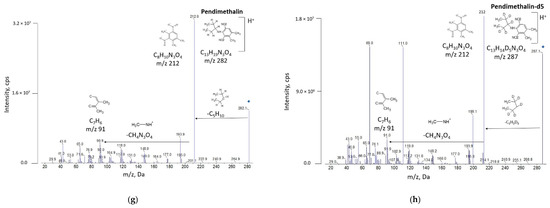MS2 fragmentation by collision-induced dissociation (CID) mass spectra for: (a) acetamiprid, (c) boscalid, (e) pyraclostrobin, (g) pendimethalin, and their isotope-labeled counterparts: (b) acetamiprid-d3, (d) boscalid-d6, (f) pyraclostrobin-d6 and (h) pendimethalin-d5.