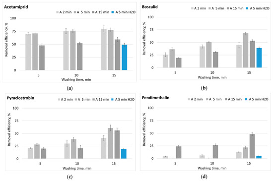 The removal efficiency of (a) acetamiprid, (b) boscalid, (c) pyraclostrobin, and (d) pendimethalin at different pesticide application times and at different wash times with the model detergent with reference to 15 min water washing (blue bar). Mean ± standard deviation (SD), n = 3. A 2 min—2 min application and MD washing, A 5 min—5 min application and MD washing, A 15 min—15 min application and MD washing, A 5 min H2O—5 min application and water washing.