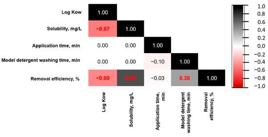 Correlations between pesticide application time, model detergent washing time, and amount of pesticide removed. Statistically significant coefficients highlighted in red (p < 0.05).