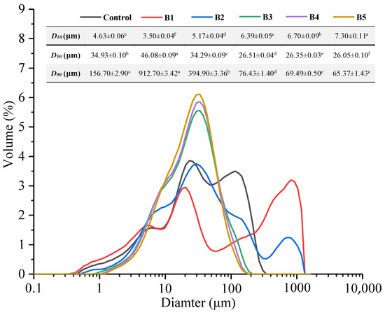 Particle size distribution of wheat bran. B1, B2, B3, B4, and B5 are the wheat brans with different particle sizes. D10, D50, and D90 are mean particle sizes at 10%, 50%, and 90% of the volume distribution, respectively. Refined wheat flour served as a control group. Different letters on each row indicate significantly different values (p < 0.05).