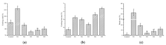 Cooking properties of whole-wheat noodles. (a) Cooking yield; (b) cooking loss rate; (c) breaking rate. Different lowercase letters on columns indicate significantly different values (p < 0.05). N1, N2, N3, N4, and N5 are noodles corresponding to wheat bran with decrease in particle size sequentially. The noodles made from refined wheat flour served as a control group.