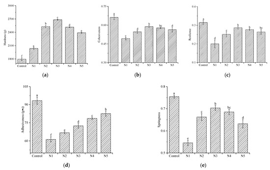 Textural properties of cooked whole-wheat noodles. (a) Hardness; (b) cohesiveness; (c) resilience; (d) adhesiveness; (e) springiness. Different lowercase letters on columns indicate significantly different values (p < 0.05). N1, N2, N3, N4, and N5 are noodles corresponding to wheat brans with decreases in particle size sequentially. The noodles made from refined wheat flour served as a control group.
