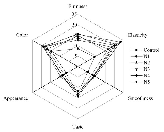 The sensory evaluation can take the consumer’s subjective evaluation into account, and the overall performance of cooked noodles was evaluated intuitively. In this study, the sensory evaluation mainly focused on the firmness, elasticity, smoothness, taste, appearance, and color of noodles (Figure 4). Compared with the control group, the score of firmness, elasticity, smoothness, appearance, and color of noodles was low in the whole-wheat groups, but the score of taste was high. With the decrease in particle size of wheat bran, the score of smoothness, taste, appearance, and color increased first and then tended to a stable value. The score of firmness and elasticity increased first and then decreased.