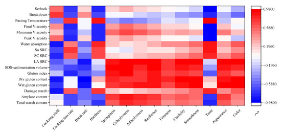 The flour quality determines the quality of its products to a large extent. Many indicators are used to evaluate the quality of flour and noodles; to clarify the relationship between the indicators, the correlation coefficients of the quality between wheat flour and its cooked noodles are calculated and shown in Figure 5.