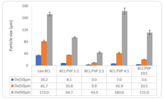 Particles sizes of raw bicalutamide, 1:1, 2:1, 4:1, and 10:1 solid dispersions. The results were obtained for freshly prepared powder samples.