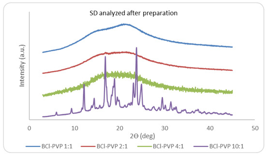 X-ray pattern of bicalutamide from the 1:1, 2:1, 4:1, 10:1 solid dispersions. The results were obtained for freshly prepared powder samples.